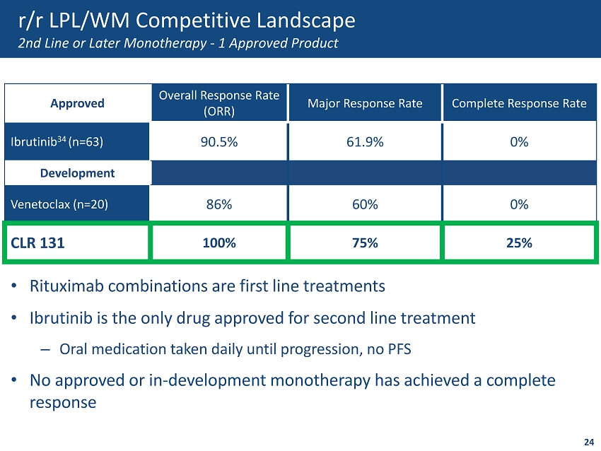 Overall Response Rate Complete Response Rate Major Response Rate MM (n=14) 42.8% --- N/A LPL/WM (n=4) 100% 25% 75% DLBCL (n=10) 30% 10% 30% LPL/WM 100% 25% 75% • CLR 131 demonstrates activity in both aggressive and indolent NHL disease • 75% of LPL/WM treated patients were refractory to rituximab or ibrutinib • Currently, only 10% of 3 rd line or later LPL/WM patients achieve a response CLR 131 Only Reported Monotherapy 33 Achieving a Complete Response in r/r LPL/WM CLR 131 r/r B - cell Malignancies Efficacy by Key Sub - indications 23