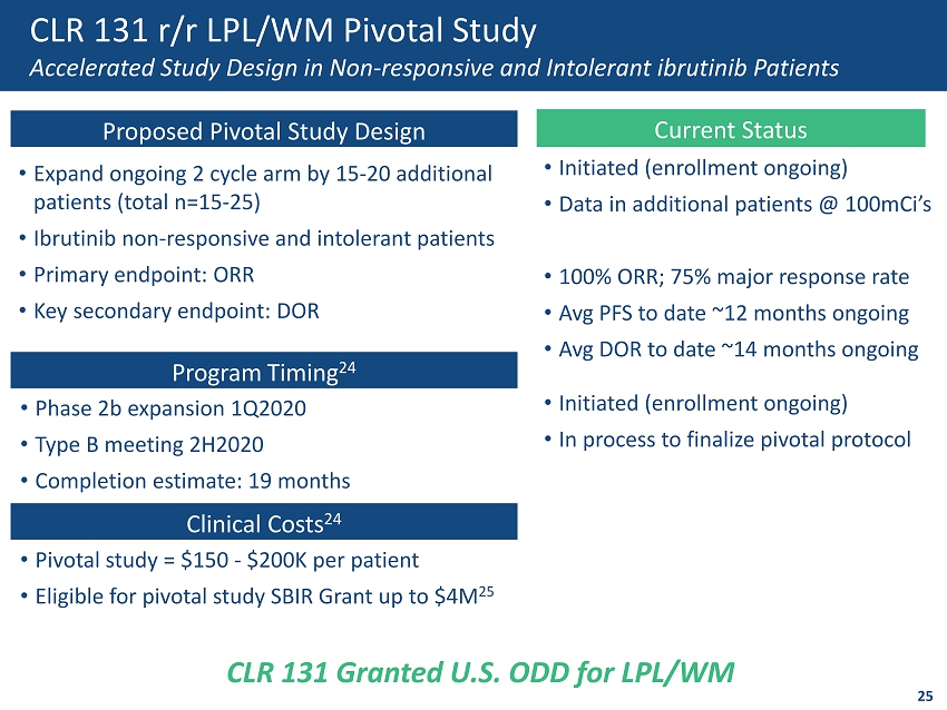 r/r LPL/WM Competitive Landscape 2nd Line or Later Monotherapy - 1 Approved Product 24 Approved Overall Response Rate (ORR) Major Response Rate Complete Response Rate Ibrutinib 34 (n=63) 90.5% 61.9% 0% Development Venetoclax (n=20) 86% 60% 0% CLR 131 100% 75% 25% • Rituximab combinations are first line treatments • Ibrutinib is the only drug approved for second line treatment ‒ Oral medication taken daily until progression, no PFS • No approved or in - development monotherapy has achieved a complete response