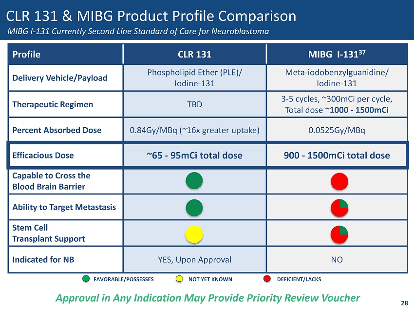 CLR 131 & MIBG Product Profile Comparison Profile CLR 131 MIBG I - 131 37 Delivery Vehicle/Payload Phospholipid Ether (PLE)/ Iodine - 131 Meta - iodobenzylguanidine/ Iodine - 131 Therapeutic Regimen TBD 3 - 5 cycles, ~300mCi per cycle, Total dose ~1000 - 1500 mC i Percent Absorbed Dose 0.84Gy/MBq (~16x greater uptake) 0.0525Gy/MBq Efficacious Dose ~65 - 95mCi total dose 900 - 1500mCi total dose Capable to Cross the Blood Brain Barrier Ability to Target Metastasis Stem Cell Transplant Support Indicated for NB YES, U pon Approval NO MIBG I - 131 Currently Second Line Standard of Care for Neuroblastoma 28 FAVORABLE/POSSESSES NOT YET KNOWN DEFICIENT/LACKS Approval in Any Indication May Provide Priority Review Voucher