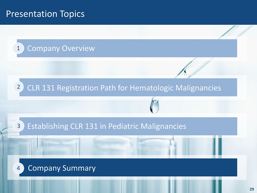 Company Summary Company Overview 1 29 CLR 131 Registration Path for Hematologic Malignancies 2 Presentation Topics Establishing CLR 131 in Pediatric Malignancies 3 4