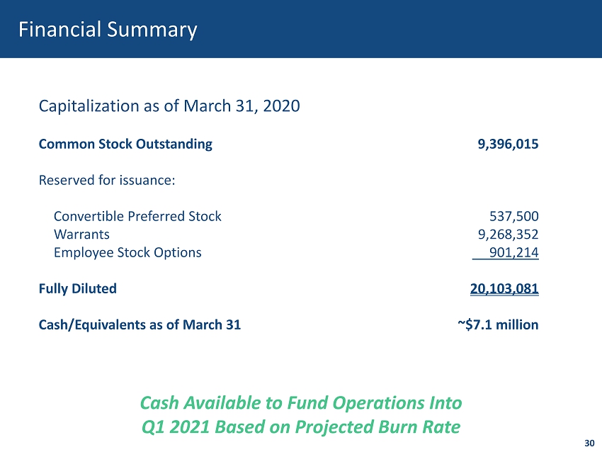 Financial Summary Capitalization as of March 31, 2020 Common Stock Outstanding 9,396,015 Reserved for issuance: Convertible Preferred Stock 537,500 Warrants 9,268,352 Employee Stock Options 901,214 Fully Diluted 20,103,081 Cash/Equivalents as of March 31 ~$7.1 million 30 Cash Available to Fund Operations Into Q1 2021 Based on Projected Burn Rate