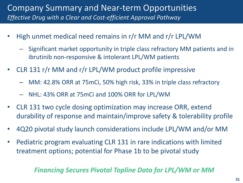 • High unmet medical need remains in r/r MM and r/r LPL/WM ‒ Significant market opportunity in triple class refractory MM patients and in ibrutinib non - responsive & intolerant LPL/WM patients • CLR 131 r/r MM and r/r LPL/WM product profile impressive ‒ MM: 42.8% ORR at 75mCi, 50% high risk, 33% in triple class refractory ‒ NHL: 43% ORR at 75mCi and 100% ORR for LPL/WM • CLR 131 two cycle dosing optimization may increase ORR, extend durability of response and maintain/improve safety & tolerability profile • 4Q20 pivotal study launch considerations include LPL/WM and/or MM • Pediatric program evaluating CLR 131 in rare indications with limited treatment options; potential for Phase 1b to be pivotal study Company Summary and Near - term Opportunities Effective Drug with a Clear and Cost - efficient Approval Pathway Financing Secures Pivotal Topline Data for LPL/WM or MM 31