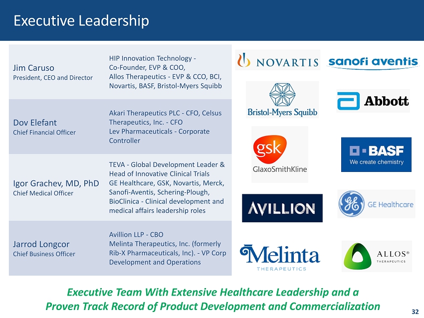 Jim Caruso President, CEO and Director HIP Innovation Technology - Co - Founder, EVP & COO, Allos Therapeutics - EVP & CCO, BCI, Novartis, BASF, Bristol - Myers Squibb Dov Elefant Chief Financial Officer Akari Therapeutics PLC - CFO, Celsus Therapeutics, Inc. - CFO Lev Pharmaceuticals - Corporate Controller Igor Grachev, MD, PhD Chief Medical Officer TEVA - Global Development Leader & Head of Innovative Clinical Trials GE Healthcare, GSK, Novartis, Merck, Sanofi - Aventis, Schering - Plough, BioClinica - Clinical development and medical affairs leadership roles Jarrod Longcor Chief Business Officer Avillion LLP - CBO Melinta Therapeutics, Inc. (formerly Rib - X Pharmaceuticals, Inc). - VP Corp Development and Operations Executive Team With Extensive Healthcare Leadership and a Proven Track Record of Product Development and Commercialization 32 Executive Leadership