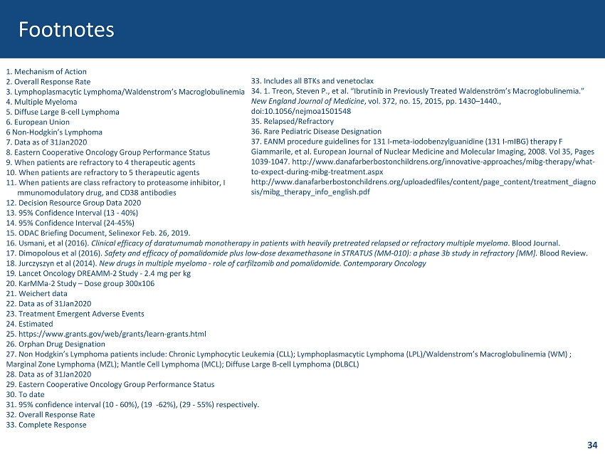 Footnotes 1. Mechanism of Action 2. Overall Response Rate 3. Lymphoplasmacytic Lymphoma/Waldenstrom’s Macroglobulinemia 4. Multiple Myeloma 5. Diffuse Large B - cell Lymphoma 6. European Union 6 Non - Hodgkin’s Lymphoma 7. Data as of 31Jan2020 8. Eastern Cooperative Oncology Group Performance Status 9. When patients are refractory to 4 therapeutic agents 10. When patients are refractory to 5 therapeutic agents 11. When patients are class refractory to proteasome inhibitor, I mmunomodulatory drug, and CD38 antibodies 12. Decision Resource Group Data 2020 13. 95% Confidence Interval (13 - 40%) 14. 95% Confidence Interval (24 - 45%) 15. ODAC Briefing Document, Selinexor Feb. 26, 2019. 16. Usmani, et al (2016). Clinical efficacy of daratumumab monotherapy in patients with heavily pretreated relapsed or refractory multiple myeloma . Blood Journal. 17. Dimopolous et al (2016). Safety and efficacy of pomalidomide plus low - dose dexamethasone in STRATUS (MM - 010): a phase 3b study in refractory [MM]. Blood Review. 18. Jurczyszyn et al (2014). New drugs in multiple myeloma - role of carfilzomib and pomalidomide. Contemporary Oncology 19 . Lancet Oncology DREAMM - 2 Study - 2.4 mg per kg 20. KarMMa - 2 Study – Dose group 300x106 21. Weichert data 22. Data as of 31Jan2020 23. Treatment Emergent Adverse Events 24. Estimated 25. https://www.grants.gov/web/grants/learn - grants.html 26 . Orphan Drug Designation 27. Non Hodgkin’s Lymphoma patients include: Chronic Lymphocytic Leukemia (CLL); Lymphoplasmacytic Lymphoma (LPL)/Waldenstrom ’s Macroglobulinemia (WM) ; Marginal Zone Lymphoma (MZL); Mantle Cell Lymphoma (MCL); Diffuse Large B - cell Lymphoma (DLBCL) 28. Data as of 31Jan2020 29. Eastern Cooperative Oncology Group Performance Status 30. To date 31. 95% confidence interval (10 - 60%), (19 - 62%), (29 - 55%) respectively. 32. Overall Response Rate 33. Complete Response 34 33. Includes all BTKs and venetoclax 34. 1. Treon, Steven P., et al. “Ibrutinib in Previously Treated Waldenström’s Macroglobulinemia.” New England Journal of Medicine , vol. 372, no. 15, 2015, pp. 1430 – 1440., doi:10.1056/nejmoa1501548 35. Relapsed/Refractory 36. Rare Pediatric Disease Designation 37. EANM procedure guidelines for 131 I - meta - iodobenzylguanidine (131 I - mIBG ) therapy F Giammarile , et al. European Journal of Nuclear Medicine and Molecular Imaging, 2008. Vol 35, Pages 1039 - 1047. http://www.danafarberbostonchildrens.org/innovative - approaches/mibg - therapy/what - to - expect - during - mibg - treatment.aspx http://www.danafarberbostonchildrens.org/uploadedfiles/content/page_content/treatment_diagno sis/mibg_therapy_info_english.pdf