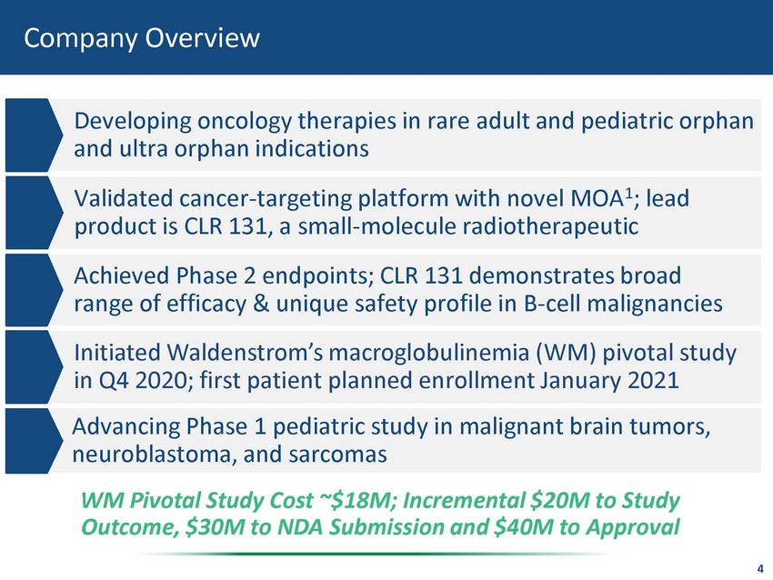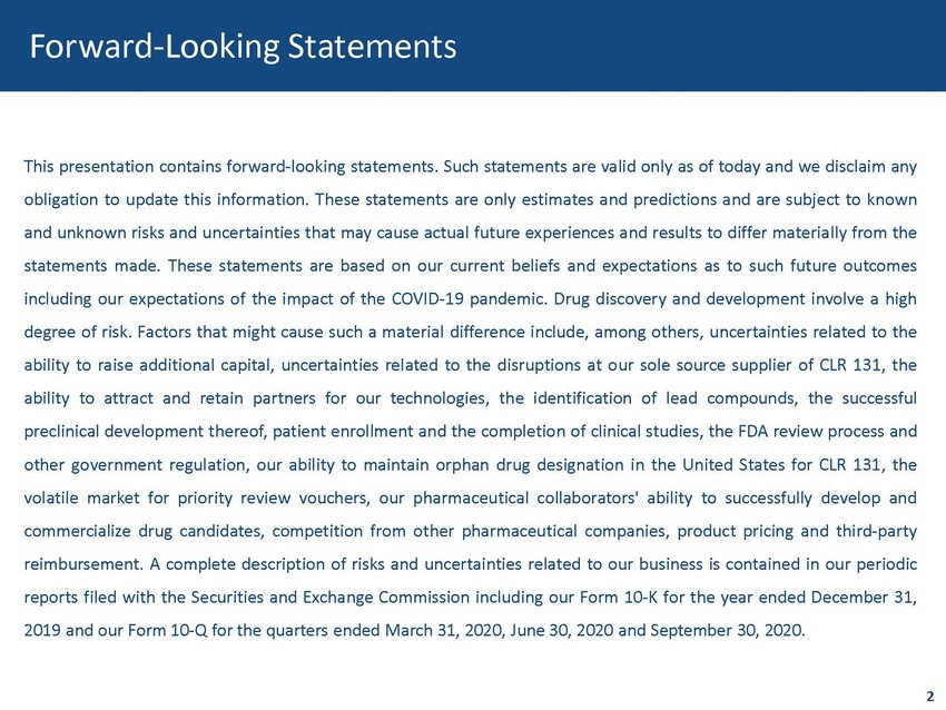 Forward - Looking Statements 2 This presentation contains forward - looking statements . Such statements are valid only as of today and we disclaim any obligation to update this information . These statements are only estimates and predictions and are subject to known and unknown risks and uncertainties that may cause actual future experiences and results to differ materially from the statements made . These statements are based on our current beliefs and expectations as to such future outcomes including our expectations of the impact of the COVID - 19 pandemic . Drug discovery and development involve a high degree of risk . Factors that might cause such a material difference include, among others, uncertainties related to the ability to raise additional capital, uncertainties related to the disruptions at our sole source supplier of CLR 131 , the ability to attract and retain partners for our technologies, the identification of lead compounds, the successful preclinical development thereof, patient enrollment and the completion of clinical studies, the FDA review process and other government regulation, our ability to maintain orphan drug designation in the United States for CLR 131 , the volatile market for priority review vouchers, our pharmaceutical collaborators' ability to successfully develop and commercialize drug candidates, competition from other pharmaceutical companies, product pricing and third - party reimbursement . A complete description of risks and uncertainties related to our business is contained in our periodic reports filed with the Securities and Exchange Commission including our Form 10 - K for the year ended December 31 , 2019 and our Form 10 - Q for the quarters ended March 31 , 2020 , June 30 , 2020 and September 30 , 2020 .