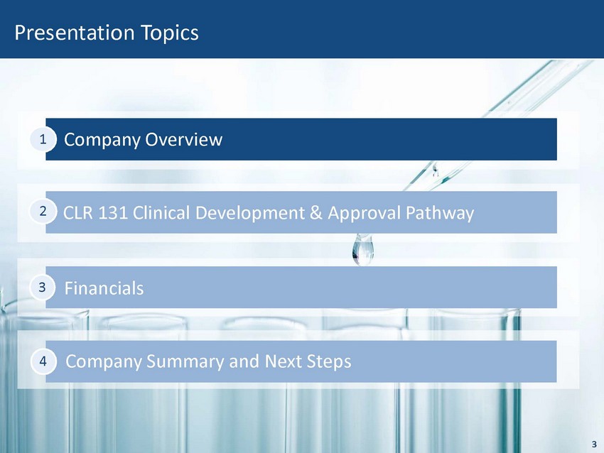 Company Summary and Next Steps Company Overview 1 3 CLR 131 Clinical Development & Approval Pathway 2 Presentation Topics 4 Financials 3