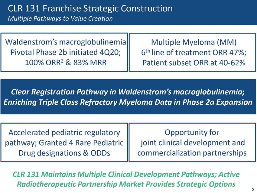 Developing oncology therapies in rare adult and pediatric orphan and ultra orphan indications 4 Advancing Phase 1 pediatric study in malignant brain tumors, neuroblastoma, and sarcomas Initiated Waldenstrom’s macroglobulinemia ( WM) pivotal study in Q4 2020; first patient planned enrollment January 2021 Company Overview Achieved Phase 2 endpoints; CLR 131 demonstrates broad range of efficacy & unique safety profile in B - cell malignancies Validated cancer - targeting platform with novel MOA 1 ; lead product is CLR 131, a small - molecule radiotherapeutic WM Pivotal Study Cost ~$18M; Incremental $20M to Study Outcome, $30M to NDA Submission and $40M to Approval