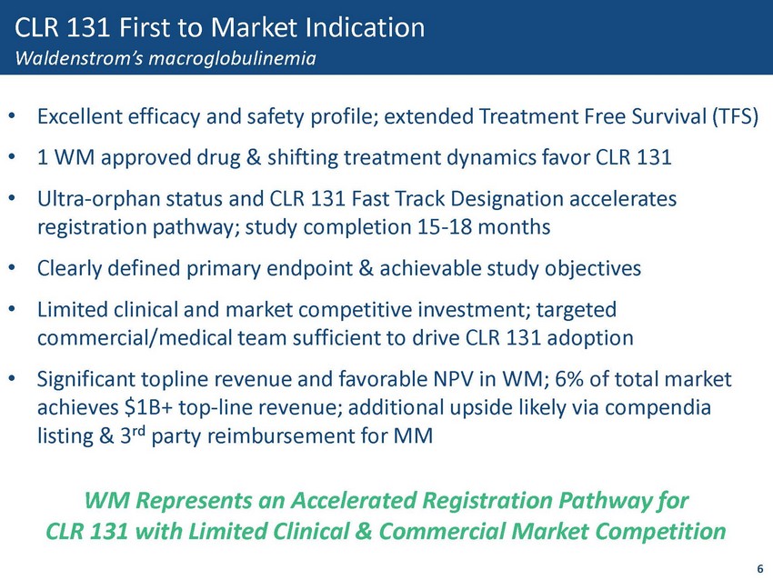CLR 131 Franchise Strategic Construction Multiple Pathways to Value Creation CLR 131 Maintains Multiple Clinical Development Pathways; Active Radiotherapeutic Partnership Market Provides Strategic Options 5 Clear Registration Pathway in Waldenstrom’s macroglobulinemia; Enriching Triple Class Refractory Myeloma Data in Phase 2a Expansion Waldenstrom’s macroglobulinemia Pivotal Phase 2b initiated 4Q20; 100% ORR 2 & 83% MRR Multiple Myeloma (MM) 6 th line of treatment ORR 47%; Patient subset ORR at 40 - 62% Accelerated pediatric regulatory pathway; Granted 4 Rare Pediatric Drug designations & ODDs Opportunity for joint clinical development and commercialization partnerships