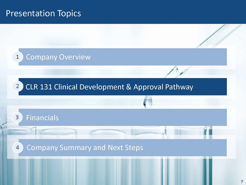 Company Summary and Next Steps Company Overview 1 7 CLR 131 Clinical Development & Approval Pathway 2 Presentation Topics 4 Financials 3