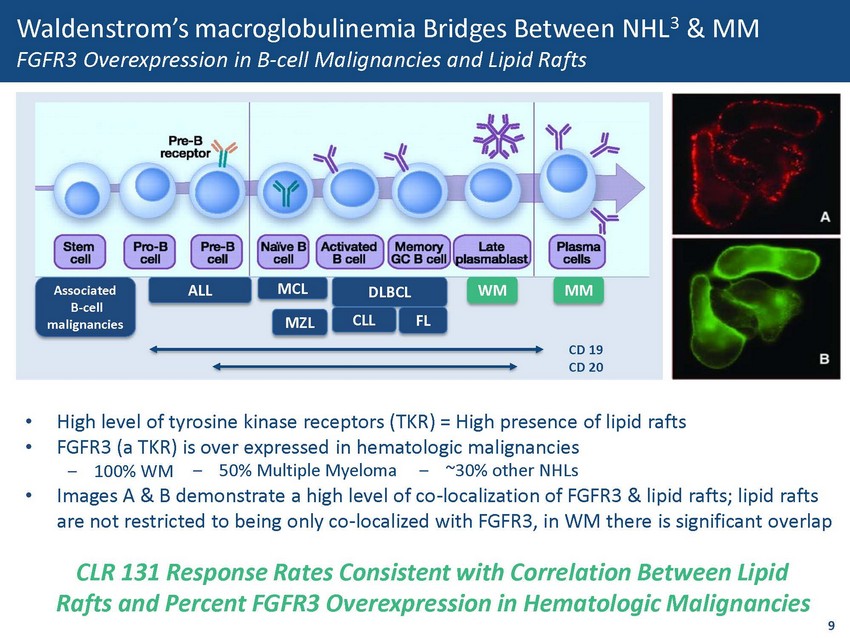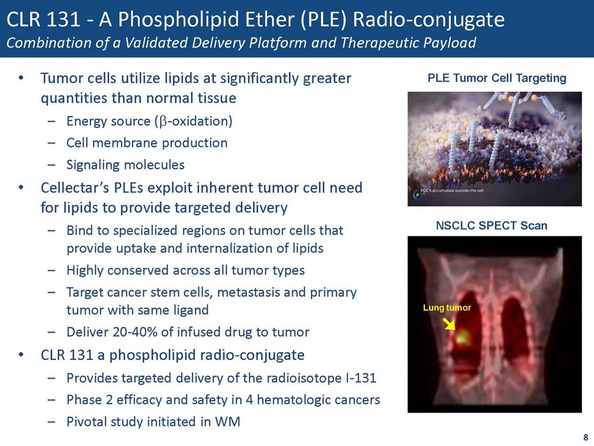 CLR 131 - A Phospholipid Ether (PLE) Radio - conjugate Combination of a Validated Delivery Platform and Therapeutic Payload • Tumor cells utilize lipids at significantly greater quantities than normal tissue – Energy source ( b - oxidation) – Cell membrane production – Signaling molecules • Cellectar’s PLEs exploit inherent tumor cell need for lipids to provide targeted delivery – Bind to specialized regions on tumor cells that provide uptake and internalization of lipids – Highly conserved across all tumor types – Target cancer stem cells, metastasis and primary tumor with same ligand – Deliver 20 - 40% of infused drug to tumor • CLR 131 a phospholipid radio - conjugate – Provides targeted delivery of the radioisotope I - 131 – Phase 2 efficacy and safety in 4 hematologic cancers – P ivotal study initiated in WM 8 PLE Tumor Cell Targeting Lung tumor NSCLC SPECT Scan