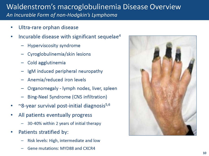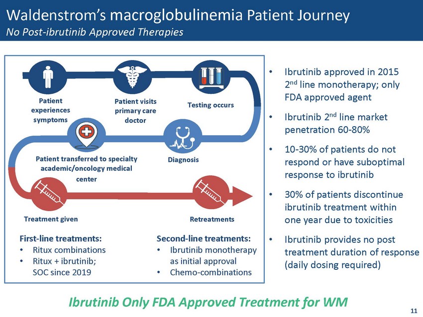 Waldenstrom’s macroglobulinemia Disease Overview An Incurable Form of non - Hodgkin’s Lymphoma • Ultra - rare orphan disease • Incurable disease with significant sequelae 4 – Hyperviscosity syndrome – Cyroglobulinemia/skin lesions – Cold agglutinemia – IgM induced peripheral neuropathy – Anemia/reduced iron levels – Organomegaly - lymph nodes, liver, spleen – Bing - Neel Syndrome (CNS infiltration) • ~8 - year survival post - initial diagnosis 5,6 • All patients eventually progress – 30 - 40% within 2 years of initial therapy • Patients stratified by: – Risk levels: High, intermediate and low – Gene mutations: MYD88 and CXCR4 10