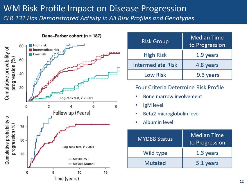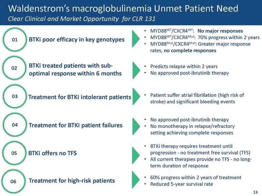 WM Risk Profile Impact on Disease Progression CLR 131 Has Demonstrated Activity in All Risk Profiles and Genotypes Risk Group Median Time to Progression High Risk 1.9 years Intermediate Risk 4.8 years Low Risk 9.3 years MYD88 Status Median Time to Progression Wild type 1.3 years Mutated 5.1 years Four Criteria Determine Risk Profile • Bone marrow involvement • IgM level • Beta2 - microglobulin level • Albumin level 12
