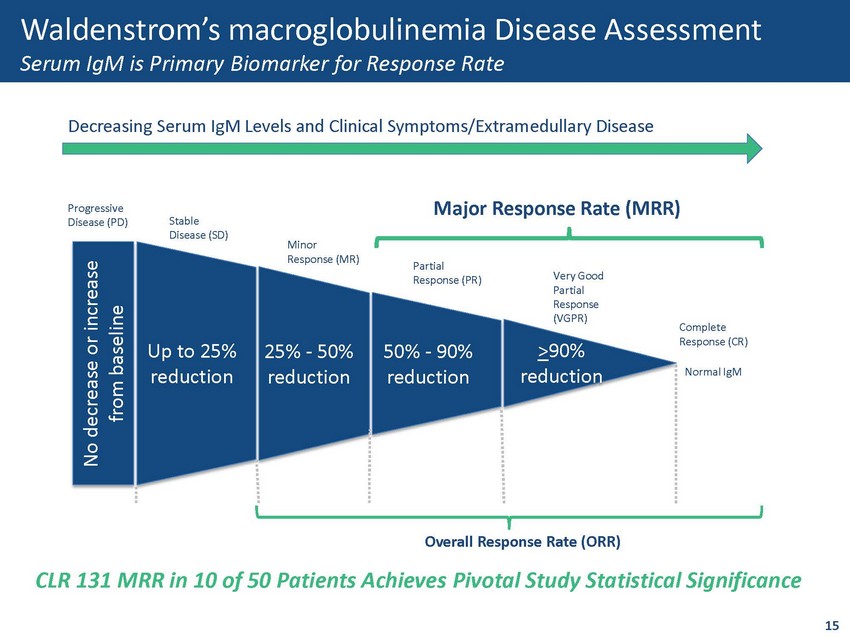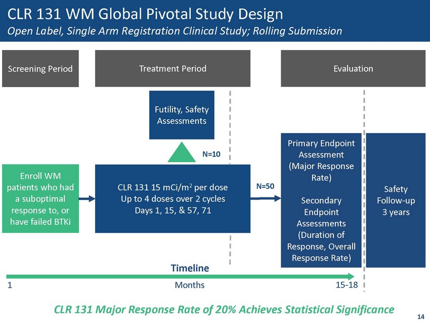 CLR 131 WM Global Pivotal Study Design Open Label, Single Arm Registration Clinical Study; Rolling Submission CLR 131 Major Response Rate of 20% Achieves Statistical Significance Primary Endpoint Assessment (Major Response Rate) Secondary Endpoint Assessments (Duration of Response, Overall Response Rate) Futility, Safety Assessments Enroll WM patients who had a suboptimal response to, or have failed BTKi CLR 131 15 mCi/m 2 per dose Up to 4 doses over 2 cycles Days 1, 15, & 57, 71 Evaluation Safety Follow - up 3 years Treatment Period N=10 N=50 Screening Period 14 1 15 - 18 Months Timeline