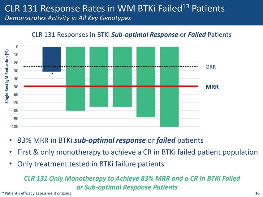 Waldenstrom’s macroglobulinemia Disease Assessment Serum IgM is Primary Biomarker for Response Rate No decrease or increase from baseline Up to 25% reduction 25% - 50% reduction 50% - 90% reduction > 90% reduction Decreasing Serum IgM Levels and Clinical Symptoms/Extramedullary Disease Progressive Disease (PD) Stable Disease (SD) Minor Response (MR) Partial Response (PR) Very Good Partial Response (VGPR) Complete Response (CR) Major Response Rate (MRR) Normal IgM 15 Overall Response Rate (ORR) CLR 131 MRR in 10 of 50 Patients Achieves Pivotal Study Statistical Significance