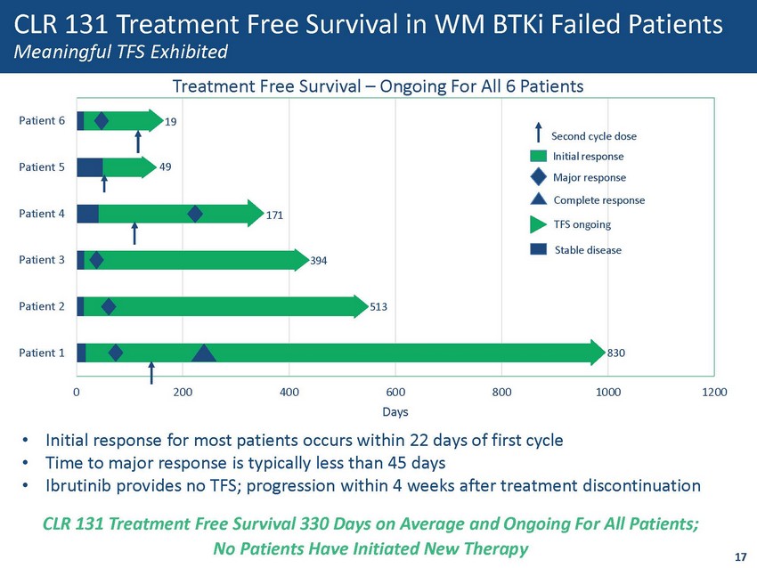 -100 -90 -80 -70 -60 -50 -40 -30 -20 -10 0 CLR 131 Responses in BTKi Sub - optimal Response or Failed Patients Single Best IgM Reduction (%) Patient’s efficacy assessment ongoing • 83% MRR in BTKi sub - optimal response or failed patients • First & only monotherapy to achieve a CR in BTKi failed patient population • Only treatment tested in BTKi failure patients CLR 131 Response Rates in WM BTKi Failed 13 Patients Demonstrates Activity in All Key Genotypes 16 CLR 131 Only Monotherapy to Achieve 83% MRR and a CR in BTKi Failed or Sub - optimal Response Patients ORR MRR