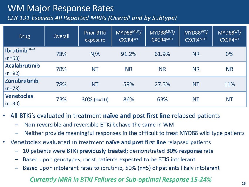 WM Major Response Rates CLR 131 Exceeds All Reported MRRs (Overall and by Subtype) Drug Overall Prior BTKi exposure MYD88 MUT / CXCR4 WT MYD88 MUT / CXCR4 MUT MYD88 WT / CXCR4 MUT MYD88 WT / CXCR4 WT Ibrutinib (n=63) 78% N/A 91.2% 61.9% NR 0% Acalabrutinib (n=92) 78% NT NR NR NR NR Zanubrutinib (n=73) 78% NT 59% 27.3% NT 11% Venetoclax (n=30) 73% 30% (n=10) 86% 63% NT NT • All BTKi’s evaluated in treatment naïve and post first line relapsed patients − Non - reversible and reversible BTKi behave the same in WM − Neither provide meaningful responses in the difficult to treat MYD88 wild type patients • Venetoclax evaluated in treatment naïve and post first line relapsed patients ‒ 10 patients were BTKi previously treated; demonstrated 30% response rate ‒ Based upon genotypes, most patients expected to be BTKi intolerant ‒ Based upon intolerant rates to ibrutinib, 50% (n=5) of patients likely intolerant Currently MRR in BTKi Failures or Sub - optimal Response 15 - 24% 11,12 18