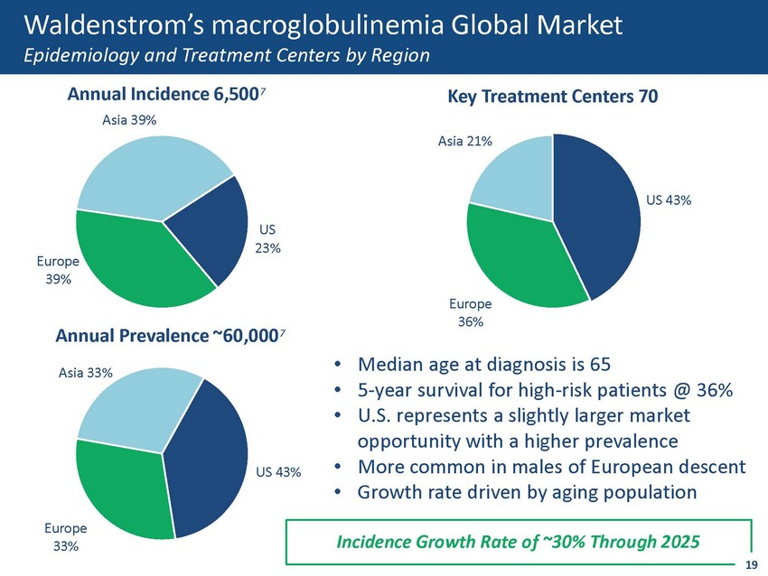Waldenstrom’s macroglobulinemia Global Market Epidemiology and Treatment Centers by Region • Median age at diagnosis is 65 • 5 - year survival for high - risk patients @ 36% • U.S. represents a slightly larger market opportunity with a higher prevalence • More common in males of European descent • Growth rate driven by aging population Incidence Growth Rate of ~30% Through 2025 US 23% Europe 39% Asia 39% Annual Incidence 6,500 7 US 43% Europe 33% Asia 33% Annual Prevalence ~60,000 7 US 43% Europe 36% Asia 21% Key Treatment Centers 70 19