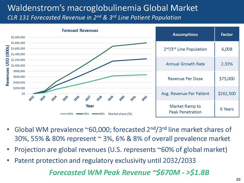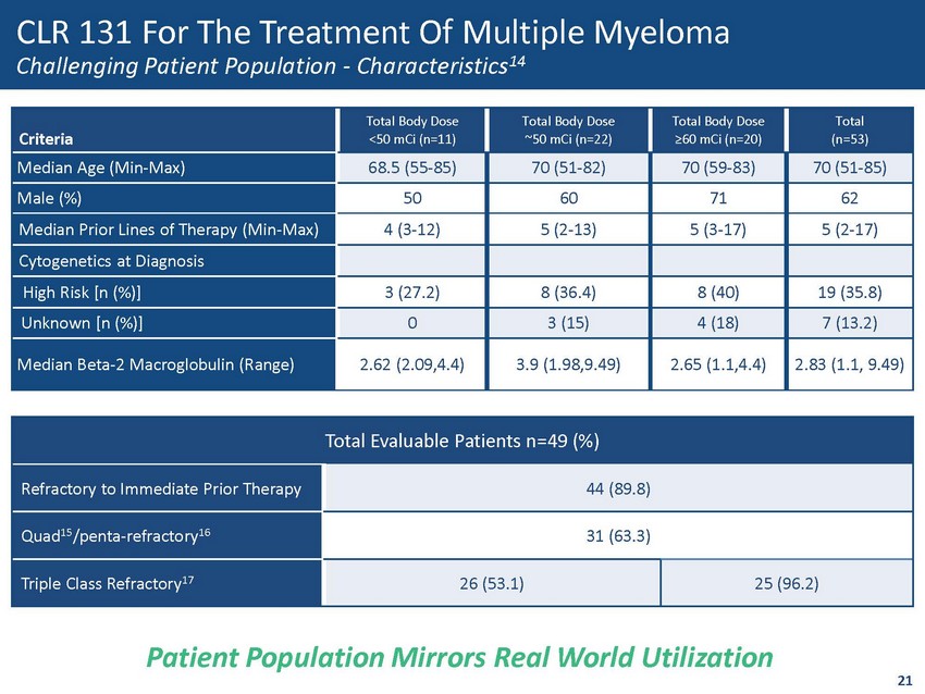 Waldenstrom’s macroglobulinemia Global Market CLR 131 Forecasted Revenue in 2 nd & 3 rd Line Patient Population Assumptions Factor 2 nd /3 rd Line Population 6,008 Annual Growth Rate 2.33% Revenue Per Dose $75,000 Avg. Revenue Per Patient $262,500 Market Ramp to Peak Penetration 6 Years • Global WM prevalence ~60,000; forecasted 2 nd /3 rd line market shares of 30%, 55% & 80% represent ~ 3%, 6% & 8% of overall prevalence market • Projection are global revenues (U.S. represents ~60% of global market) • Patent protection and regulatory exclusivity until 2032/2033 $0 $200,000 $400,000 $600,000 $800,000 $1,000,000 $1,200,000 $1,400,000 $1,600,000 $1,800,000 $2,000,000 Revenues USD (000s) Year Forecast Revenues 30% 55% 80% Market share (%) 20 Forecasted WM Peak Revenue ~$670M - >$1.8B