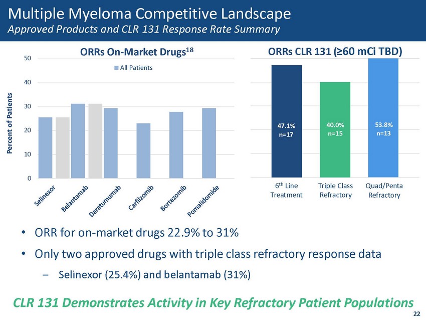 47.1% n=17 40.0% n=15 n=17 53.8% n=13 ORR for On - Market Drugs 0 10 20 30 40 50 Percent of Patients All Patients ORRs On - Market Drugs 18 • ORR for on - market drugs 22.9% to 31% • Only two approved drugs with triple class refractory response data ‒ Selinexor (25.4%) and belantamab (31%) Multiple Myeloma Competitive Landscape Approved Products and CLR 131 Response Rate Summary ORRs CLR 131 ( ≥60 mCi TBD) CLR 131 Demonstrates Activity in Key Refractory Patient Populations 22 6 th Line Treatment Triple Class Refractory Quad/Penta Refractory