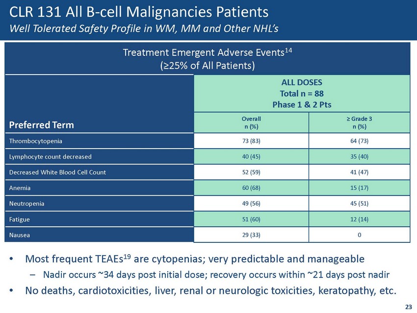 CLR 131 All B - cell Malignancies Patients Well Tolerated Safety Profile in WM, MM and Other NHL’s Treatment Emergent Adverse Events 14 ( ≥25% of All Patients) Preferred Term ALL DOSES Total n = 88 Phase 1 & 2 Pts Overall n (%) ≥ Grade 3 n (%) Thrombocytopenia 73 (83) 64 (73) Lymphocyte count decreased 40 (45) 35 (40) Decreased White Blood Cell Count 52 (59) 41 (47) Anemia 60 (68) 15 (17) Neutropenia 49 (56) 45 (51) Fatigue 51 (60) 12 (14) Nausea 29 (33) 0 23 • Most frequent TEAEs 19 are cytopenias; very predictable and manageable – Nadir occurs ~34 days post initial dose; recovery occurs within ~21 days post nadir • No deaths, cardiotoxicities, liver, renal or neurologic toxicities, keratopathy, etc.