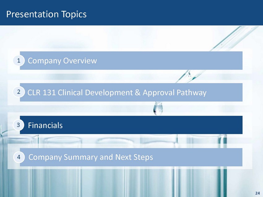 Company Summary and Next Steps Company Overview 1 24 CLR 131 Clinical Development & Approval Pathway 2 Presentation Topics 4 Financials 3