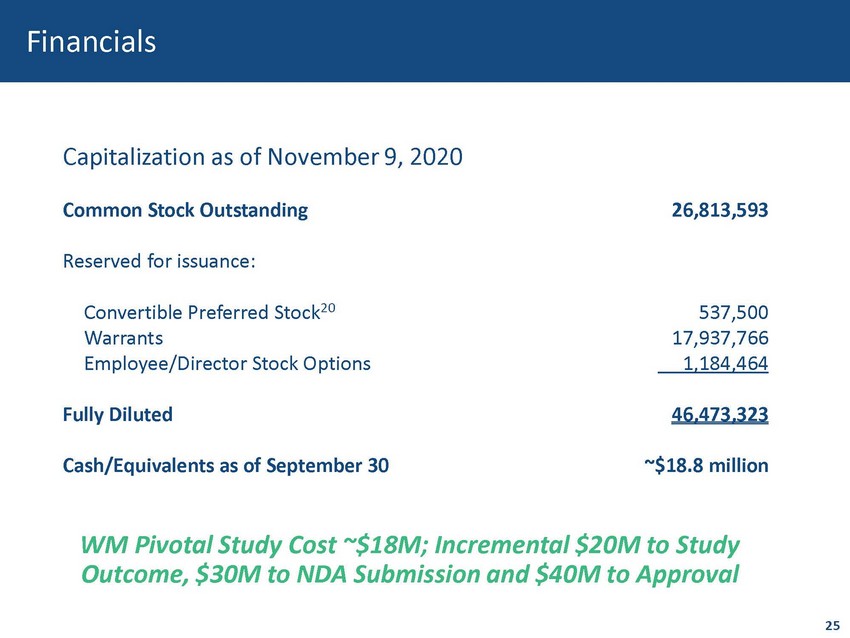 Financials 25 Capitalization as of November 9, 2020 Common Stock Outstanding 26,813,593 Reserved for issuance: Convertible Preferred Stock 20 537,500 Warrants 17,937,766 Employee/Director Stock Options 1,184,464 Fully Diluted 46,473,323 Cash/Equivalents as of September 30 ~$18.8 million WM Pivotal Study Cost ~$18M; Incremental $20M to Study Outcome, $30M to NDA Submission and $40M to Approval