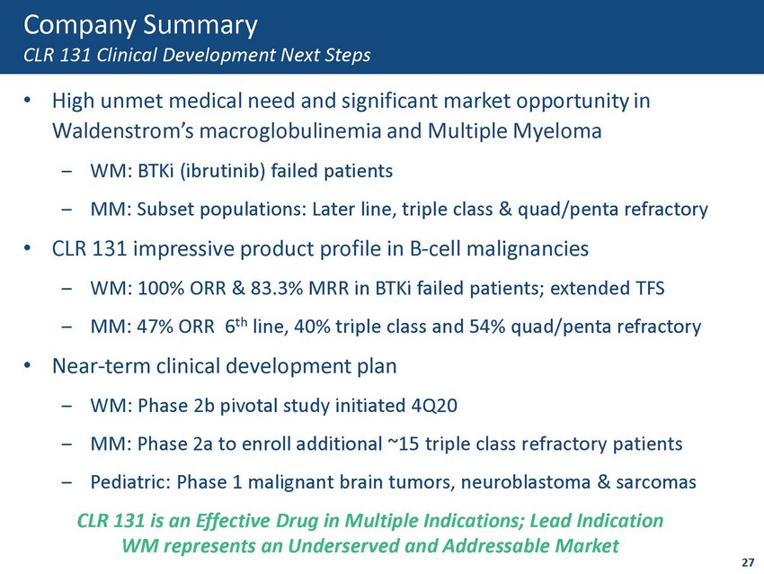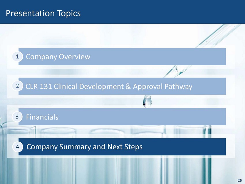Company Summary and Next Steps Company Overview 1 CLR 131 Clinical Development & Approval Pathway 2 Presentation Topics 4 Financials 3 26