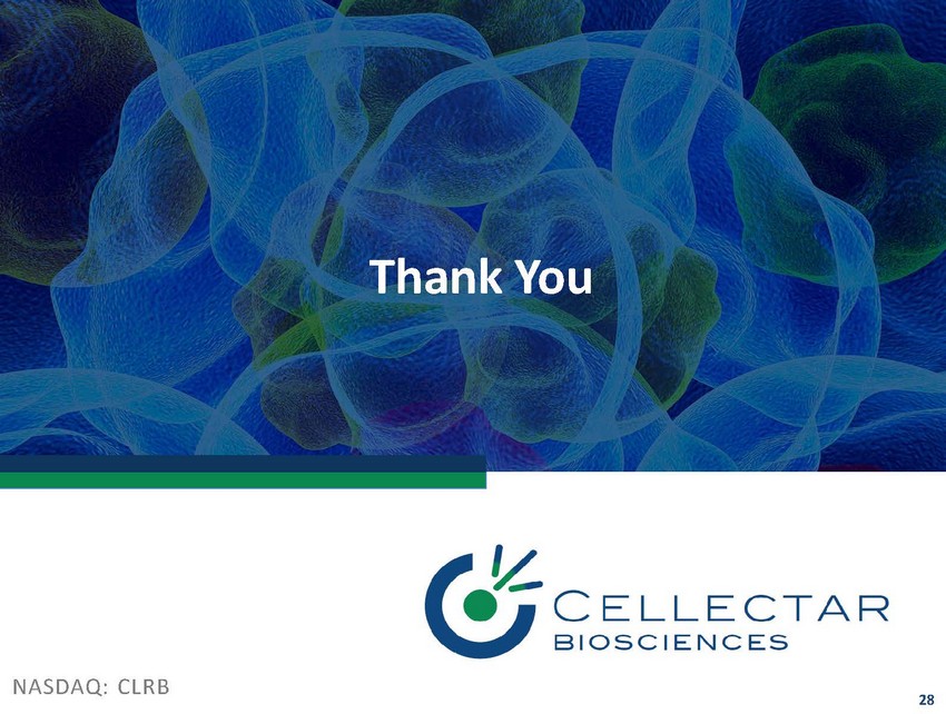 • High unmet medical need and significant market opportunity in Waldenstrom’s macroglobulinemia and Multiple Myeloma ‒ WM: BTKi (ibrutinib) failed patients ‒ MM: Subset populations: Later line, triple class & quad/penta refractory • CLR 131 impressive product profile in B - cell malignancies ‒ WM: 100% ORR & 83.3% MRR in BTKi failed patients; extended TFS ‒ MM: 47% ORR 6 th line, 40% triple class and 54% quad/penta refractory • Near - term clinical development plan ‒ WM: Phase 2b pivotal study initiated 4Q20 ‒ MM: Phase 2a to enroll additional ~15 triple class refractory patients ‒ Pediatric: Phase 1 malignant brain tumors, neuroblastoma & sarcomas Company Summary CLR 131 Clinical Development Next Steps 27 CLR 131 is an Effective Drug in Multiple Indications; Lead Indication WM represents an Underserved and Addressable Market