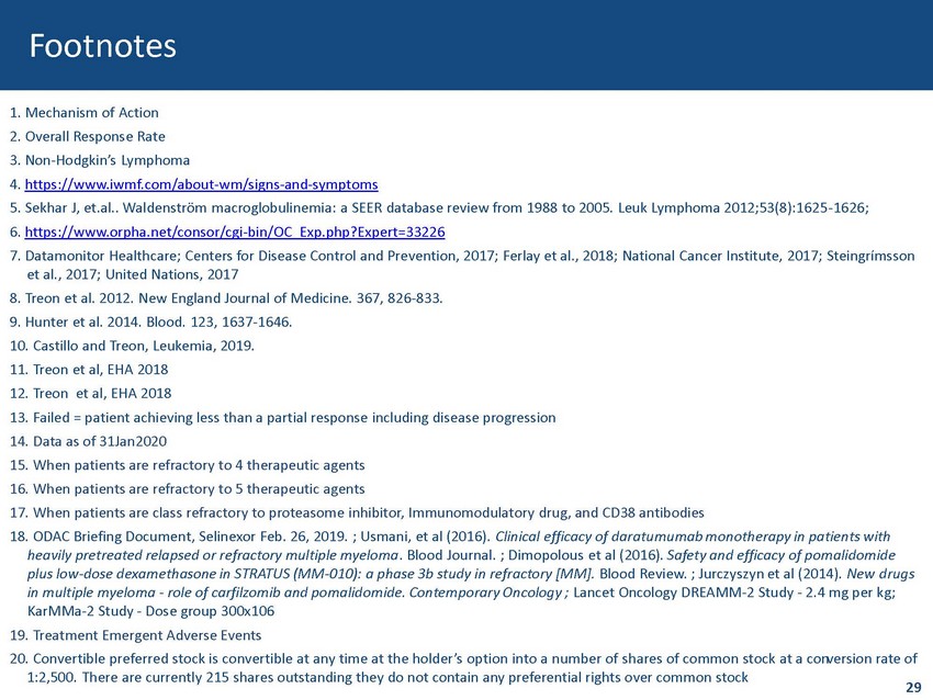 Footnotes 1. Mechanism of Action 2. Overall Response Rate 3. Non - Hodgkin’s Lymphoma 4. https://www.iwmf.com/about - wm/signs - and - symptoms 5. Sekhar J, et.al.. Waldenström macroglobulinemia: a SEER database review from 1988 to 2005. Leuk Lymphoma 2012;53(8):1625 - 1626 ; 6. https://www.orpha.net/consor/cgi - bin/OC_Exp.php?Expert=33226 7. Datamonitor Healthcare; Centers for Disease Control and Prevention, 2017; Ferlay et al., 2018; National Cancer Institute, 201 7; Steingrímsson et al., 2017; United Nations, 2017 8. Treon et al. 2012. New England Journal of Medicine. 367, 826 - 833. 9. Hunter et al. 2014. Blood. 123, 1637 - 1646. 10. Castillo and Treon, Leukemia, 2019. 11. Treon et al, EHA 2018 12. Treon et al, EHA 2018 13. Failed = patient achieving less than a partial response including disease progression 14. Data as of 31Jan2020 15. When patients are refractory to 4 therapeutic agents 16. When patients are refractory to 5 therapeutic agents 17. When patients are class refractory to proteasome inhibitor, Immunomodulatory drug, and CD38 antibodies 18. ODAC Briefing Document, Selinexor Feb. 26, 2019. ; Usmani, et al (2016). Clinical efficacy of daratumumab monotherapy in patients with heavily pretreated relapsed or refractory multiple myeloma . Blood Journal. ; Dimopolous et al (2016). Safety and efficacy of pomalidomide plus low - dose dexamethasone in STRATUS (MM - 010): a phase 3b study in refractory [MM]. Blood Review. ; Jurczyszyn et al (2014). New drugs in multiple myeloma - role of carfilzomib and pomalidomide. Contemporary Oncology ; Lancet Oncology DREAMM - 2 Study - 2.4 mg per kg; KarMMa - 2 Study - Dose group 300x106 19. Treatment Emergent Adverse Events 20. C onvertible preferred stock is convertible at any time at the holder’s option into a number of shares of common stock at a con ver sion rate of 1:2,500. There are currently 215 shares outstanding they do not contain any preferential rights over common stock 29