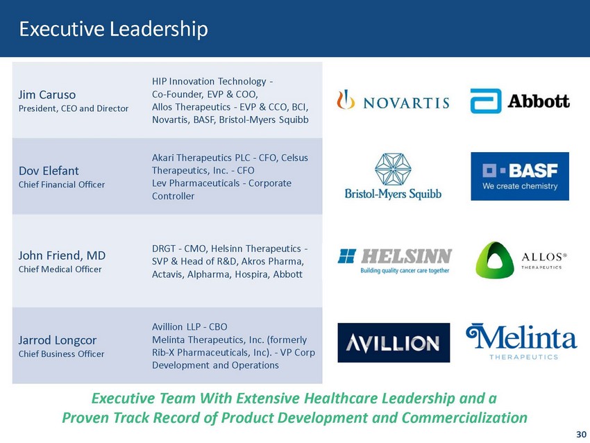 Jim Caruso President, CEO and Director HIP Innovation Technology - Co - Founder, EVP & COO, Allos Therapeutics - EVP & CCO, BCI, Novartis, BASF, Bristol - Myers Squibb Dov Elefant Chief Financial Officer Akari Therapeutics PLC - CFO, Celsus Therapeutics, Inc. - CFO Lev Pharmaceuticals - Corporate Controller John Friend, MD Chief Medical Officer DRGT - CMO, Helsinn Therapeutics - SVP & Head of R&D, Akros Pharma, Actavis, Alpharma, Hospira, Abbott Jarrod Longcor Chief Business Officer Avillion LLP - CBO Melinta Therapeutics, Inc. (formerly Rib - X Pharmaceuticals, Inc). - VP Corp Development and Operations Executive Team With Extensive Healthcare Leadership and a Proven Track Record of Product Development and Commercialization 30 Executive Leadership