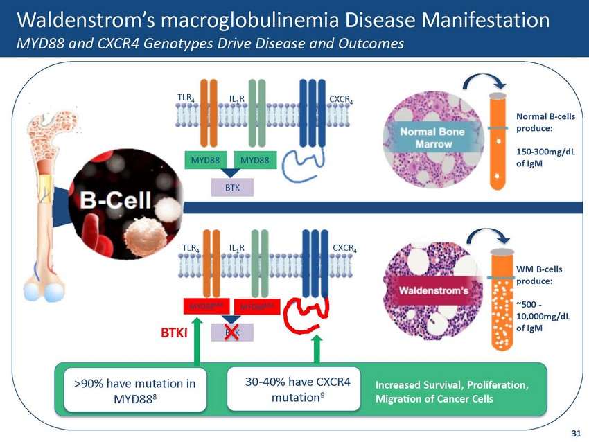 Waldenstrom’s macroglobulinemia Disease Manifestation MYD88 and CXCR4 Genotypes Drive Disease and Outcomes 30 - 40% have CXCR4 mutation 9 >90% have mutation in MYD88 8 Increased Survival, Proliferation, Migration of Cancer Cells TLR 4 TLR 4 IL 1 R IL 1 R CXCR 4 CXCR 4 MYD88 MYD88 BTK MYD88 Mut BTK BTKi Normal B - cells produce: 150 - 300mg/dL of IgM WM B - cells produce: ~500 - 10,000mg/dL of IgM MYD88 Mut 31