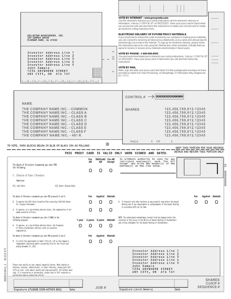 1OF 1 1 234567 234567 234567 234567 234567 Mark, sign and date your proxy card and return it in the postage-paid envelope we have provided or return it to Vote Processing, c/o Broadridge, 51 Mercedes Way, Edgewood, NY 11717. NAME THE COMPANY NAME INC. - COMMON CELLECTAR BIOSCIENCES, INC. 100 CAMPUS DRIVE FLORHAM PARK, NJ 07932 VOTE BY INTERNET - www.proxyvote.com Use the Internet to transmit your voting instructions and for electronic delivery of information. Vote by 11:59 P.M. ET on 06/22/2021. Have your proxy card in hand when you access the web site and follow the instructions to obtain your records and to create an electronic voting instruction form. ELECTRONIC DELIVERY OF FUTURE PROXY MATERIALS If you would like to reduce the costs incurred by our company in mailing proxy materials, you can consent to receiving all future proxy statements, proxy cards and annual reports electronically via e-mail or the Internet. To sign up for electronic delivery, please follow the instructions above to vote using the Internet and, when prompted, indicate that you agree to receive or access proxy materials electronically in future years. Investor Address Line 1 VOTE BY PHONE - 1-800-690-6903 Investor Address Line 2 Use any touch-tone telephone to transmit your voting instructions. Vote by 11:59 P.M. ET Investor Address Line 3 on 06/22/2021. Have your proxy card in hand when you call and then follow the Investor Address Line 4 instructions. Investor Address John Sample Line 5 234567 234567 VOTE BY MAIL 2 SHARES 123,456,789,012.12345 THE COMPANY NAME INC. - CLASS A123,456,789,012.12345 THE COMPANY NAME INC. - CLASS B123,456,789,012.12345 THE COMPANY NAME INC. - CLASS C123,456,789,012.12345 THE COMPANY NAME INC. - CLASS D123,456,789,012.12345 THE COMPANY NAME INC. - CLASS E123,456,789,012.12345 THE COMPANY NAME INC. - CLASS F123,456,789,012.12345 THE COMPANY NAME INC. - 401 K123,456,789,012.12345 x TO VOTE, MARK BLOCKS BELOW IN BLUE OR BLACK INK AS FOLLOWS: PAGE 1OF 2 KEEP THIS PORTION FOR YOUR RECORDS THIS PROXY CARD IS VALID ONLY WHEN SIGNED AND DATED. DETACH AND RETURN THIS PORTION ONLY 0000000000 For Withhold For All AllAllExcept To withhold authority to vote for any individual nominee(s), mark “For All Except” and write the number(s) of the nominee(s) on the line below. 02 Nominees 01) John Neis02) Asher Chanan-Kahn 000 The Board of Directors recommends you vote FOR proposals 2 and 3.ForAgainst Abstain ForAgainst Abstain To approve the 2021 Stock Incentive Plan reserving 6,000,000 shares for issuance thereunder. To approve, on a non-binding advisory basis, the compensation of our named executive officers. 000 000 To transact such other business as may properly come before the Annual Meeting and at any adjournments or postponements of the Annual Meeting in accordance with our by-laws. 000 The Board of Directors recommends you vote 3 YEARS on the following proposal:1 year 2 years 3 years Abstain NOTE: The undersigned acknowledges receipt from the Company before the execution of this proxy of the Notice of Annual Meeting of Stockholders and a Proxy Statement for the Annual Meeting of Stockholders. To approve, on a non-binding advisory basis, the frequency of future stockholders advisory votes on executive compensation. 0000 The Board of Directors recommends you vote FOR proposals 5 and 6.ForAgainst Abstain 0000514941_1 R1.0.0.177 Please sign exactly as your name(s) appear(s) hereon. When signing as attorney, executor, administrator, or other fiduciary, please give full title as such. Joint owners should each sign personally. All holders must sign. If a corporation or partnership, please sign in full corporate or partnership name by authorized officer. 000 JOB # Investor Address Line 1 Investor Address Line 2 Investor Address Line 3 Investor Address Line 4 Investor Address Line 5 John Sample 1234 ANYWHERE STREET ANY CITY, ONA1A 1A1 SHARES CUSIP # SEQUENCE # Signature [PLEASE SIGN WITHIN BOX] Date Signature (Joint Owners) Date |