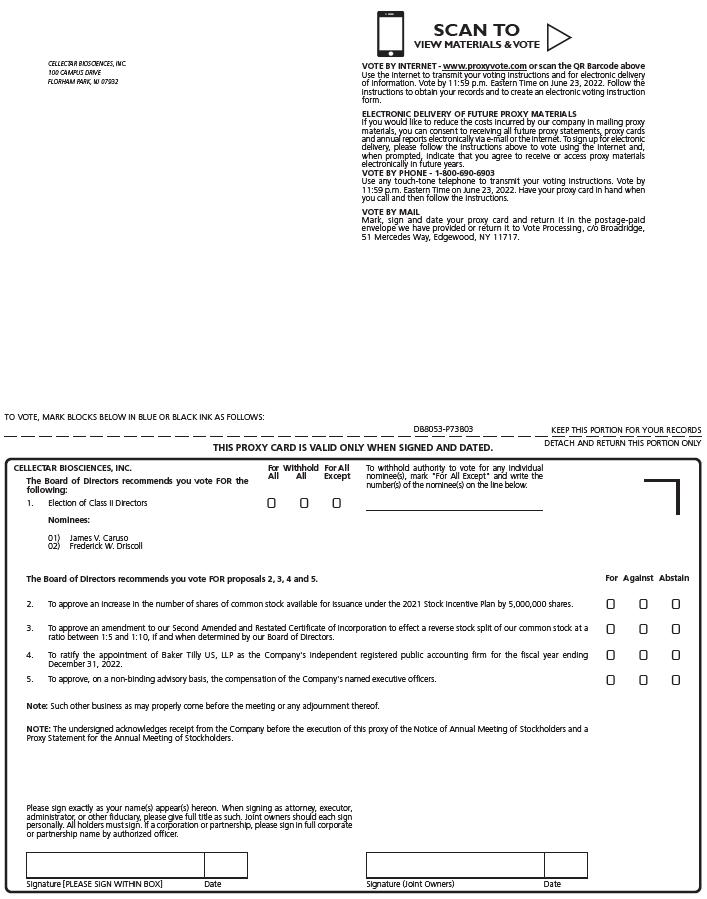 Signature [PLEASE SIGN WITHIN BOX] Date Signature (Joint Owners) Date TO VOTE, MARK BLOCKS BELOW IN BLUE OR BLACK INK AS FOLLOWS: KEEP THIS PORTION FOR YOUR RECORDS DETACH AND RETURN THIS PORTION ONLY THIS PROXY CARD IS VALID ONLY WHEN SIGNED AND DATED. D88053 - P73803 1. Election of Class II Directors Nominees: 1) James V. Caruso 2) Frederick W. Driscoll For Withhold For All A ll Al l Except ! ! ! To withhold authority to vote for any individual nominee(s), mark "For All Except" and write the number(s) of the nominee(s) on the line below . CELLECTAR BIOSCIENCES, INC. The Board of Directors recommends you vote FOR the following: CELLECTAR BIOSCIENCES, INC. 100 CAMPUS DRIVE FLORHAM PARK, NJ 07932 Please sign exactly as your name(s) appear(s) hereon . When signing as attorney, executor, administrator, or other fiduciary, please give full title as such . Joint owners should each sign personally . All holders must sign . If a corporation or partnership, please sign in full corporate or partnership name by authorized officer . 3. To approve an amendment to our Second Amended and Restated Certificate of Incorporation to effect a reverse stock split of our common stock at a ratio between 1:5 and 1:10, if and when determined by our Board of Directors. 4. To ratify the appointment of Baker Tilly US, LLP as the Company's independent registered public accounting firm for the fiscal year ending December 31, 2022. 5. To approve, on a non - binding advisory basis, the compensation of the Company's named executive officers. The Board of Directors recommends you vote FOR proposals 2, 3, 4 and 5. 2. To approve an increase in the number of shares of common stock available for issuance under the 2021 Stock Incentive Plan by 5,000,000 shares. Note: Such other business as may properly come before the meeting or any adjournment thereof. NOTE: The undersigned acknowledges receipt from the Company before the execution of this proxy of the Notice of Annual Meeting of Stockholders and a Proxy Statement for the Annual Meeting of Stockholders. For Against Abstain ! ! ! ! ! ! ! ! ! ! ! ! VOTE BY INTERNET - www . proxyvote . com or scan the QR Barcode above Use the Internet to transmit your voting instructions and for electronic delivery of information . Vote by 11 : 59 p . m . Eastern Time on June 23 , 2022 . Follow the instructions to obtain your records and to create an electronic voting instruction form . ELECTRONIC DELIVERY OF FUTURE PROXY MATERIALS If you would like to reduce the costs incurred by our company in mailing proxy materials, you can consent to receiving all future proxy statements, proxy cards and annual reports electronically via e - mail or the Internet . To sign up for electronic delivery, please follow the instructions above to vote using the Internet and, when prompted, indicate that you agree to receive or access proxy materials electronically in future years . VOTE BY PHONE - 1 - 800 - 690 - 6903 Use any touch - tone telephone to transmit your voting instructions . Vote by 11 : 59 p . m . Eastern Time on June 23 , 2022 . Have your proxy card in hand when you call and then follow the instructions . VOTE BY MAIL Mark, sign and date your proxy card and return it in the postage - paid envelope we have provided or return it to Vote Processing, c/o Broadridge, 51 Mercedes Way, Edgewood, NY 11717 . SCAN TO VIEW MATERIALS & VOTE w