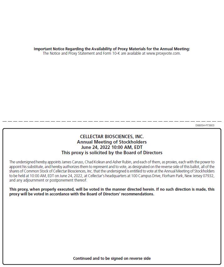 Important Notice Regarding the Availability of Proxy Materials for the Annual Meeting: The Notice and Proxy Statement and Form 10 - K are available at www.proxyvote.com. D88054 - P73803 CELLECTAR BIOSCIENCES, INC. Annual Meeting of Stockholders June 24, 2022 10:00 AM, EDT This proxy is solicited by the Board of Directors The undersigned hereby appoints James Caruso, Chad Kolean and Asher Rubin, and each of them, as proxies, each with the power to appoint his substitute, and hereby authorizes them to represent and to vote, as designated on the reverse side of this ballot, all of the shares of Common Stock of Cellectar Biosciences, Inc . that the undersigned is entitled to vote at the Annual Meeting of Stockholders to be held at 10 : 00 AM, EDT on June 24 , 2022 , at Cellectar's headquarters at 100 Campus Drive, Florham Park, New Jersey 07932 , and any adjournment or postponement thereof . This proxy, when properly executed, will be voted in the manner directed herein . If no such direction is made, this proxy will be voted in accordance with the Board of Directors' recommendations . Continued and to be signed on reverse side