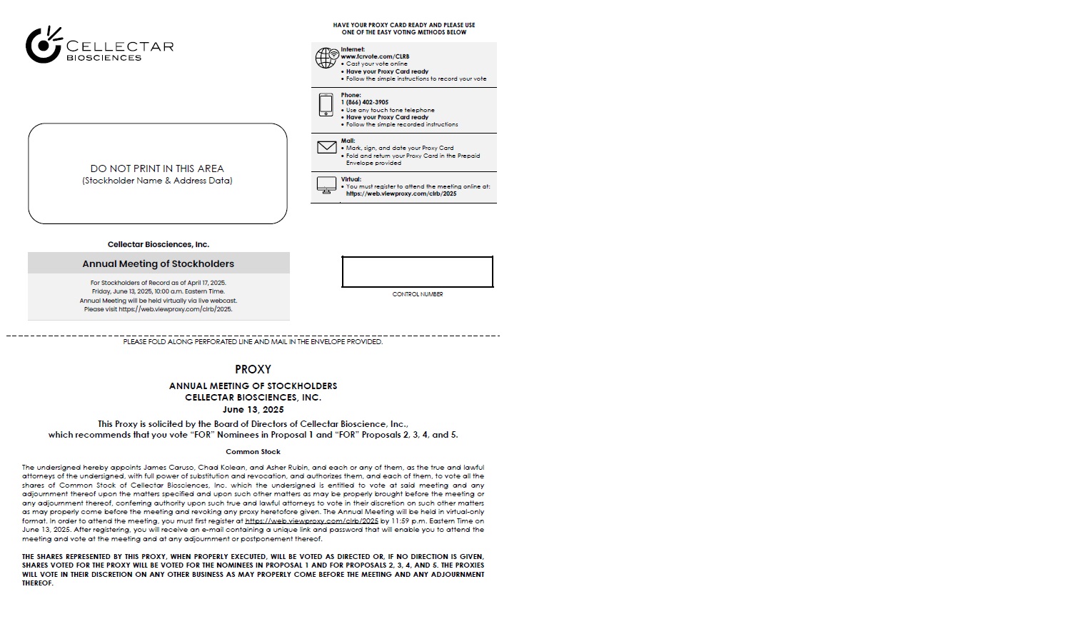 The 2025 Annual Meeting of Stockholders (the “Annual Meeting”) of Cellectar Biosciences, Inc. (the “Company”) will be held on Friday, June 13, 2025, at 10:00 A.M., local time, virtually over the internet. You will be able to attend the Annual Meeting, vote your shares electronically and submit your questions online by visiting https://web.viewproxy.com/clrb/2025 and entering the 11-digit control number included in the notice containing instructions on how to access Annual Meeting materials, your proxy card, or the voting instructions that accompanied the proxy materials. We will hold the Annual Meeting for the following purposes: