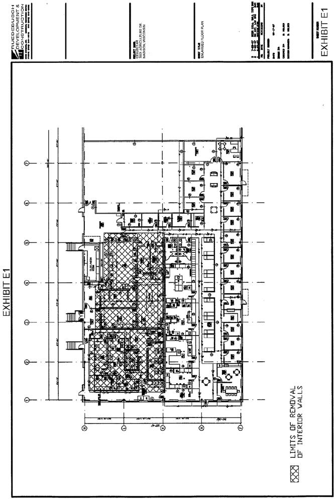 Tenant shall remove all interior walls in the cross-hatched area shown on Exhibit E-1 and the surface of all damaged concrete flooring shown in such cross-hatched area and shall replace all such concrete flooring that is removed with new concrete flooring of equivalent thickness to the flooring that was removed.