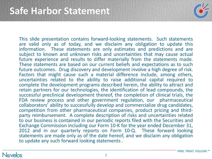 Safe Harbor Statement FIND . TREAT . FOLLOW . ™ 2 This slide presentation contains forward - looking statements . Such statements are valid only as of today, and we disclaim any obligation to update this information . These statements are only estimates and predictions and are subject to known and unknown risks and uncertainties that may cause actual future experience and results to differ materially from the statements made . These statements are based on our current beliefs and expectations as to such future outcomes . Drug discovery and development involve a high degree of risk . Factors that might cause such a material difference include, among others, uncertainties related to the ability to raise additional capital required to complete the development programs described herein, the ability to attract and retain partners for our technologies, the identification of lead compounds, the successful preclinical development thereof, the completion of clinical trials, the FDA review process and other government regulation, our pharmaceutical collaborators’ ability to successfully develop and commercialize drug candidates, competition from other pharmaceutical companies, product pricing and third - party reimbursement . A complete description of risks and uncertainties related to our business is contained in our periodic reports filed with the Securities and Exchange Commission including our Form 10 - K for the year ended December 31 , 2012 and in our quarterly reports on Form 10 - Q . These forward looking statements are made only as of the date hereof, and we disclaim any obligation to update any such forward looking statements .