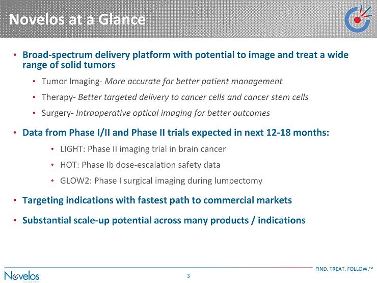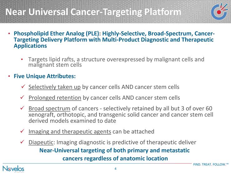 Novelos at a Glance FIND . TREAT . FOLLOW . ™ 3 • Broad - spectrum delivery platform with potential to image and treat a wide range of solid tumors • Tumor Imaging - More accurate for better patient management • Therapy - Better targeted delivery to cancer cells and cancer stem cells • Surgery - Intraoperative optical imaging for better outcomes • Data from Phase I/II and Phase II trials expected in next 12 - 18 months: • LIGHT: Phase II imaging trial in brain cancer • HOT: Phase Ib dose - escalation safety data • GLOW2: Phase I surgical imaging during lumpectomy • Targeting indications with fastest path to commercial markets • S ubstantial scale - up potential across many products / indications