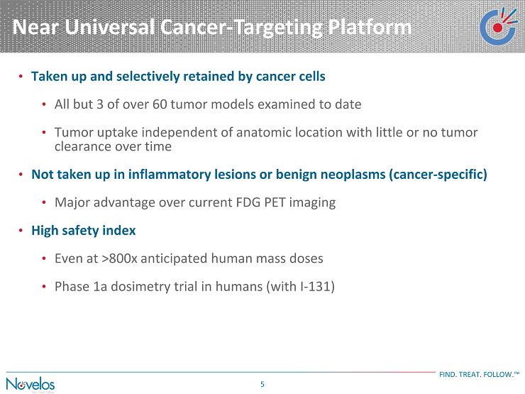 Near Universal Cancer - Targeting Platform FIND . TREAT . FOLLOW . ™ 4 • Phospholipid Ether Analog (PLE ) : Highly - Selective, Broad - Spectrum, Cancer - Targeting Delivery Platform with Multi - Product Diagnostic and Therapeutic Applications • Targets lipid rafts , a structure overexpressed by malignant cells and malignant stem cells • Five Unique Attributes: x Selectively taken up by cancer cells AND cancer stem cells x Prolonged retention by cancer cells AND cancer stem cells x Broad spectrum of cancers - selectively retained by all but 3 of over 60 xenograft, orthotopic, and transgenic solid cancer and cancer stem cell derived models examined to date x Imaging and therapeutic agents can be attached x Diapeutic : Imaging diagnostic is predictive of therapeutic deliver Near - Universal targeting of both primary and metastatic cancers regardless of anatomic location
