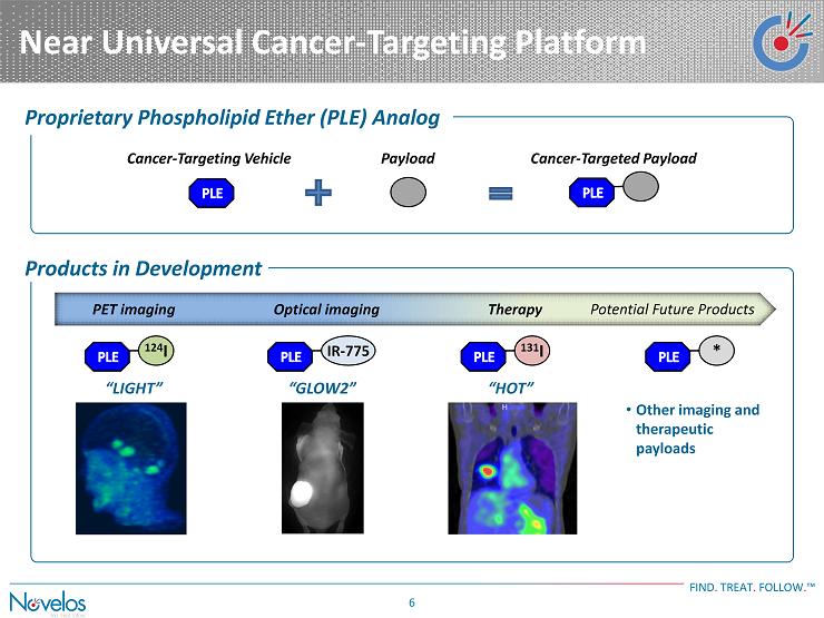 Near Universal Cancer - Targeting Platform FIND . TREAT . FOLLOW . ™ 5 • Taken up and selectively retained by cancer cells • A ll but 3 of over 60 tumor models examined to date • Tumor uptake independent of anatomic location with little or no tumor clearance over time • Not taken up in inflammatory lesions or benign neoplasms (cancer - specific) • Major advantage over current FDG PET imaging • High safety index • Even at >800x anticipated human mass doses • Phase 1a dosimetry trial in humans (with I - 131)