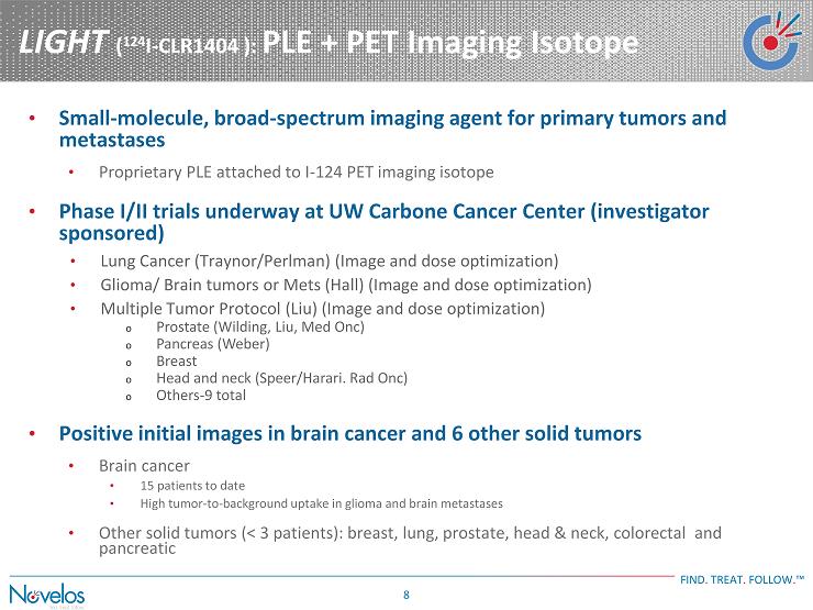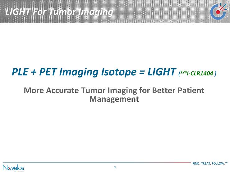LIGHT For Tumor Imaging FIND . TREAT . FOLLOW . ™ 7 PLE + PET Imaging Isotope = LIGHT ( 124 I - CLR1404 ) More Accurate Tumor Imaging for Better Patient Management