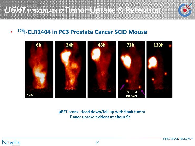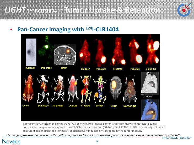 LIGHT ( 124 I - CLR1404 ) : Tumor Uptake & Retention FIND . TREAT . FOLLOW . ™ 9 • Pan - Cancer Imaging with 124 I - CLR1404 Representative nuclear and/or microPET/CT or MRI hybrid images demonstrating primary and metastatic tumor conspicuity. Images were acquired from 24 - 96h post - i.v. injection (80 - 140 µCi of 124I - CLR1404) in a variety of human subcutaneous or orthotopic xenograft, spontaneously induced, or transgenic in vivo tumor models. The images provided above and on the following three slides are for illustrative purposes only and may not be indicative of all results.