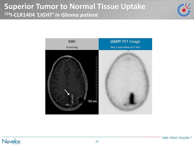 Superior Tumor to Normal Tissue Uptake 124 I - CLR1404 ‘ LIGHT ’ in Glioma patient FIND . TREAT . FOLLOW . ™ 11 LIGHT PET Image Day 2 post - dose at 5 mCi MRI Screening