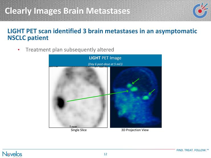 Clearly Images Brain Metastases FIND . TREAT . FOLLOW . ™ 12 LIGHT PET Image (Day 6 post - dose at 5 mCi) 3D Projection View Single Slice LIGHT PET scan identified 3 brain metastases in an asymptomatic NSCLC patient • Treatment plan subsequently altered