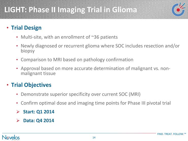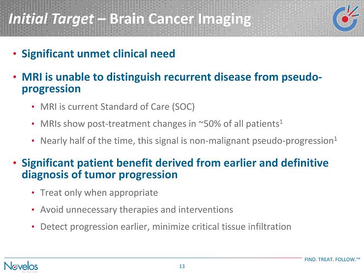 Initial Target – Brain Cancer Imaging FIND . TREAT . FOLLOW . ™ 13 • Significant unmet clinical need • MRI is unable to distinguish recurrent disease from pseudo - progression • MRI is current Standard of Care (SOC) • MRIs show post - treatment changes in ~50% of all patients 1 • Nearly half of the time, this signal is non - malignant pseudo - progression 1 • Significant patient benefit derived from earlier and definitive diagnosis of tumor progression • Treat only when appropriate • Avoid unnecessary therapies and interventions • Detect progression earlier, minimize critical tissue infiltration
