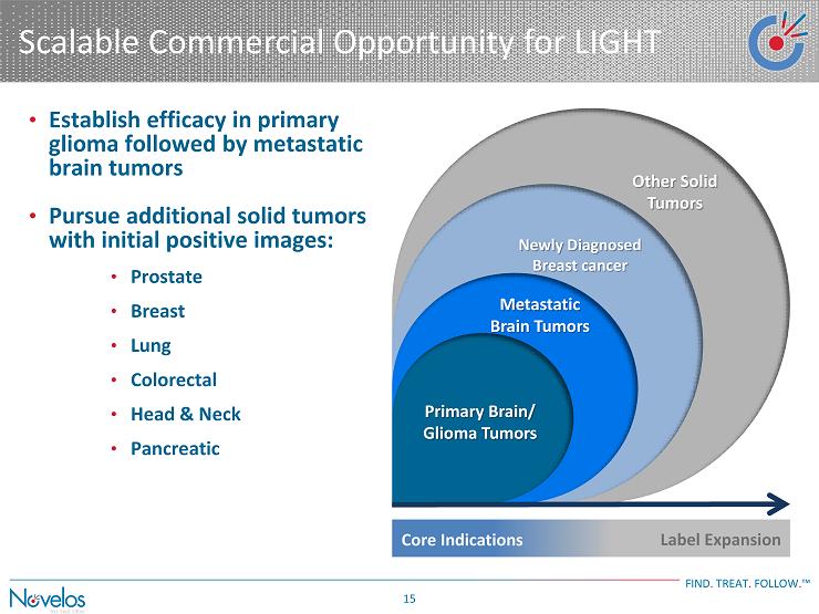 LIGHT: Phase II Imaging Trial in Glioma FIND . TREAT . FOLLOW . ™ 14 • Trial Design • Multi - site, with an enrollment of ~36 patients • Newly diagnosed or recurrent glioma where SOC includes resection and/or biopsy • Comparison to MRI based on pathology confirmation • Approval based on more accurate determination of malignant vs. non - malignant tissue • Trial Objectives • Demonstrate superior specificity over current SOC (MRI) • Confirm optimal dose and imaging time points for Phase III pivotal trial » Start: Q1 2014 » Data: Q4 2014