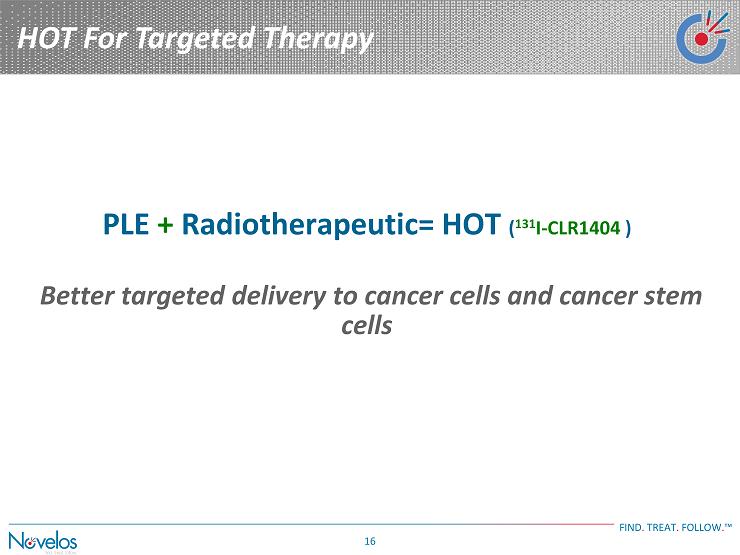HOT For Targeted Therapy FIND . TREAT . FOLLOW . ™ 16 PLE + Radiotherapeutic= HOT ( 131 I - CLR1404 ) Better targeted delivery to cancer cells and cancer stem cells