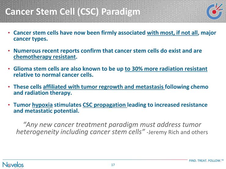 Cancer Stem Cell (CSC) Paradigm FIND . TREAT . FOLLOW . ™ 17 • Cancer stem cells have now been firmly associated with most, if not all , major cancer types. • Numerous recent reports confirm that cancer stem cells do exist and are chemotherapy resistant . • Glioma stem cells are also known to be up to 30% more radiation resistant relative to normal cancer cells. • These cells affiliated with tumor regrowth and metastasis following chemo and radiation therapy. • Tumor hypoxia stimulates CSC propagation leading to increased resistance and metastatic potential. “ Any new cancer treatment paradigm must address tumor heterogeneity including cancer stem cells” - Jeremy Rich and others
