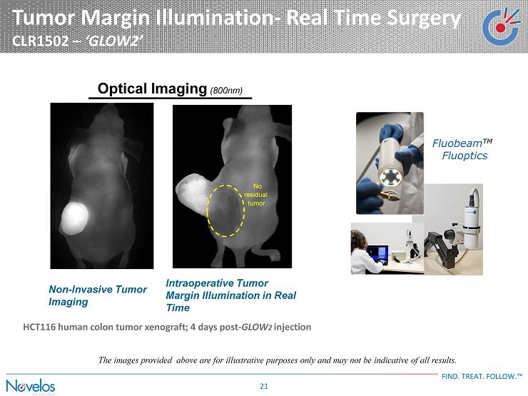 Improving Cancer Surgery Outcomes CLR1502 – ‘GLOW2’ FIND . TREAT . FOLLOW . ™ 20 • Optical imaging agent for intraoperative tumor margin illumination • Proprietary cancer - targeting delivery vehicle (PLE) attached to near - infrared fluorophore • More accurate visualization of tumor margins during surgery for more complete malignant tissue removal • Better patient management and outcomes from fewer repeat surgeries and reduced recurrence • Potential for meaningful healthcare savings