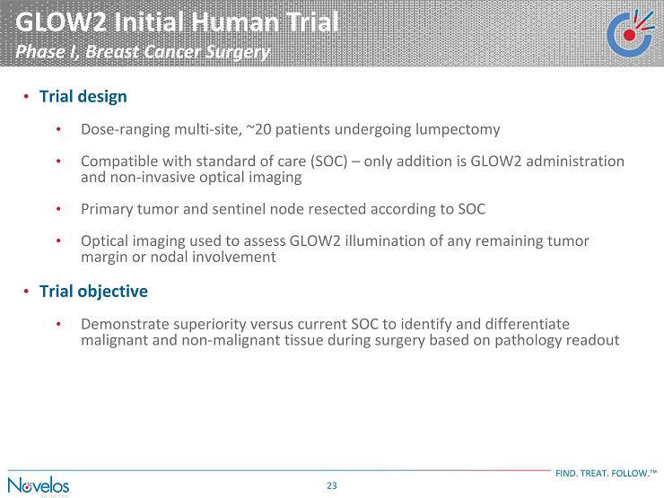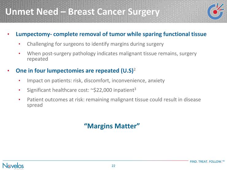 Unmet Need – Breast Cancer Surgery FIND . TREAT . FOLLOW . ™ 22 • Lumpectomy - complete removal of tumor while sparing functional tissue • Challenging for surgeons to identify margins during surgery • When post - surgery pathology indicates malignant tissue remains, surgery repeated • One in four lumpectomies are repeated ( U.S) 2 • Impact on patients: risk, discomfort, inconvenience, anxiety • Significant healthcare cost: ~$22,000 inpatient 3 • Patient outcomes at risk: remaining malignant tissue could result in disease spread “Margins Matter”